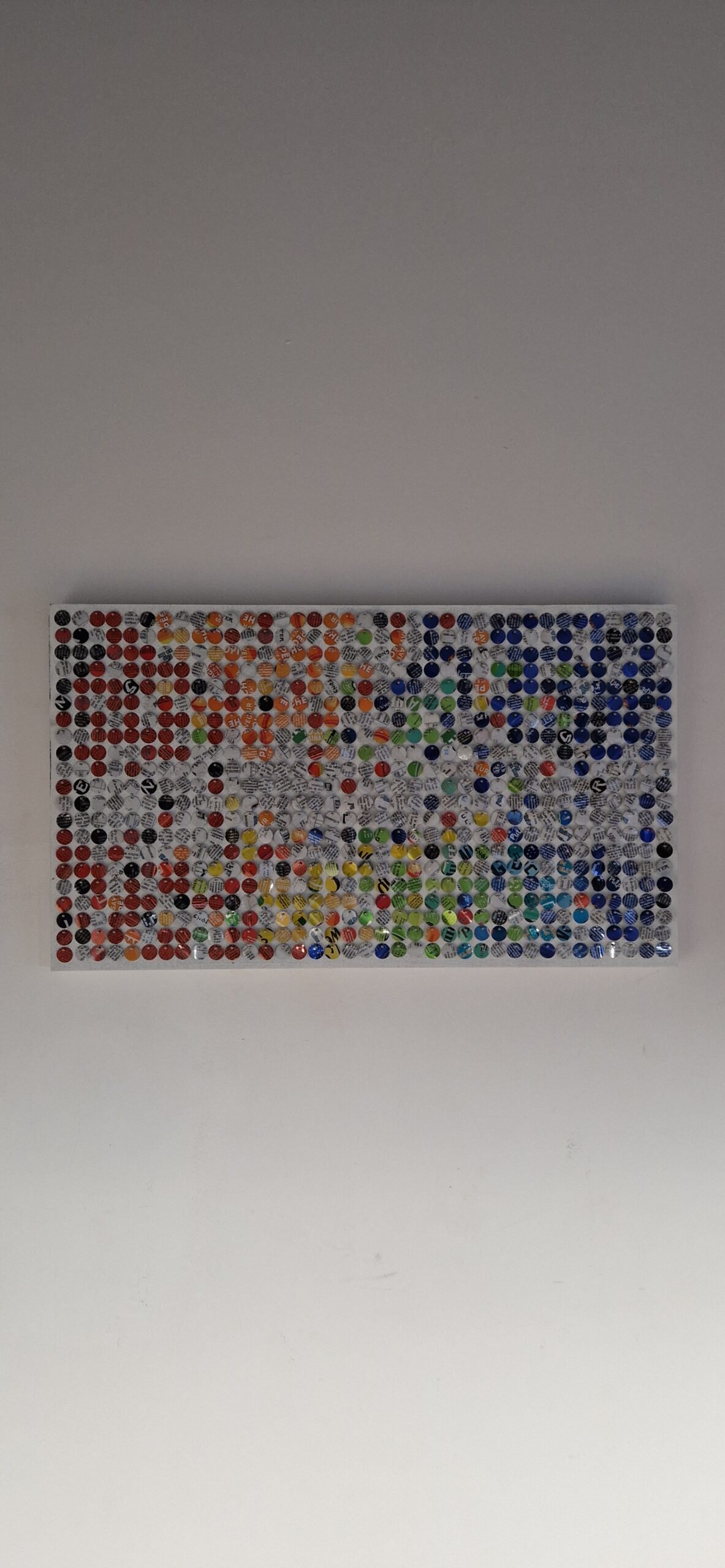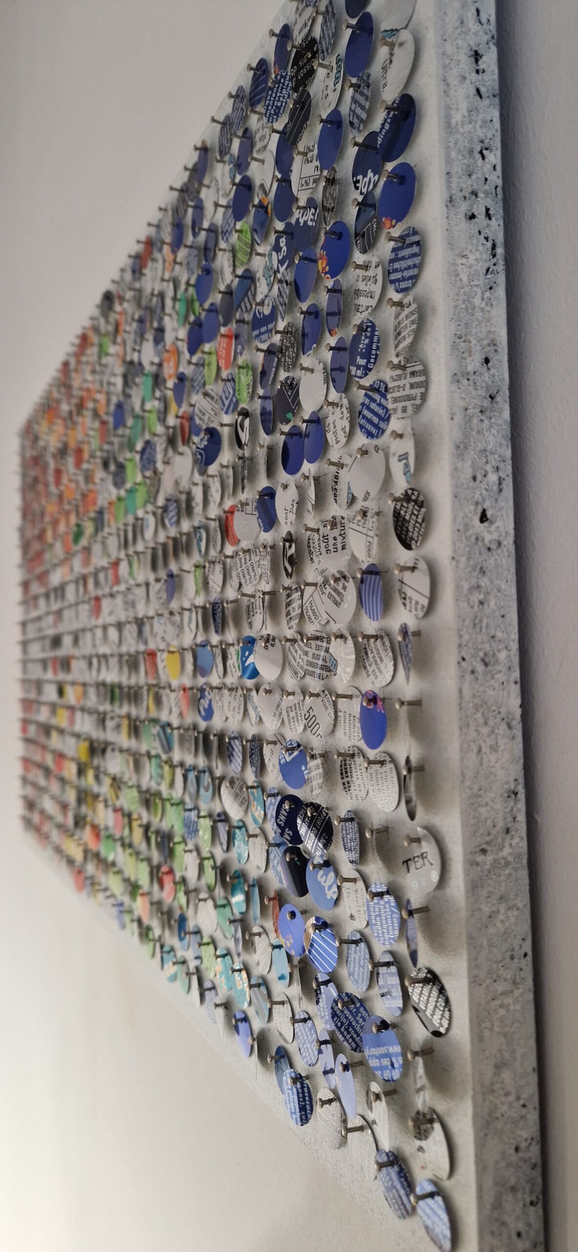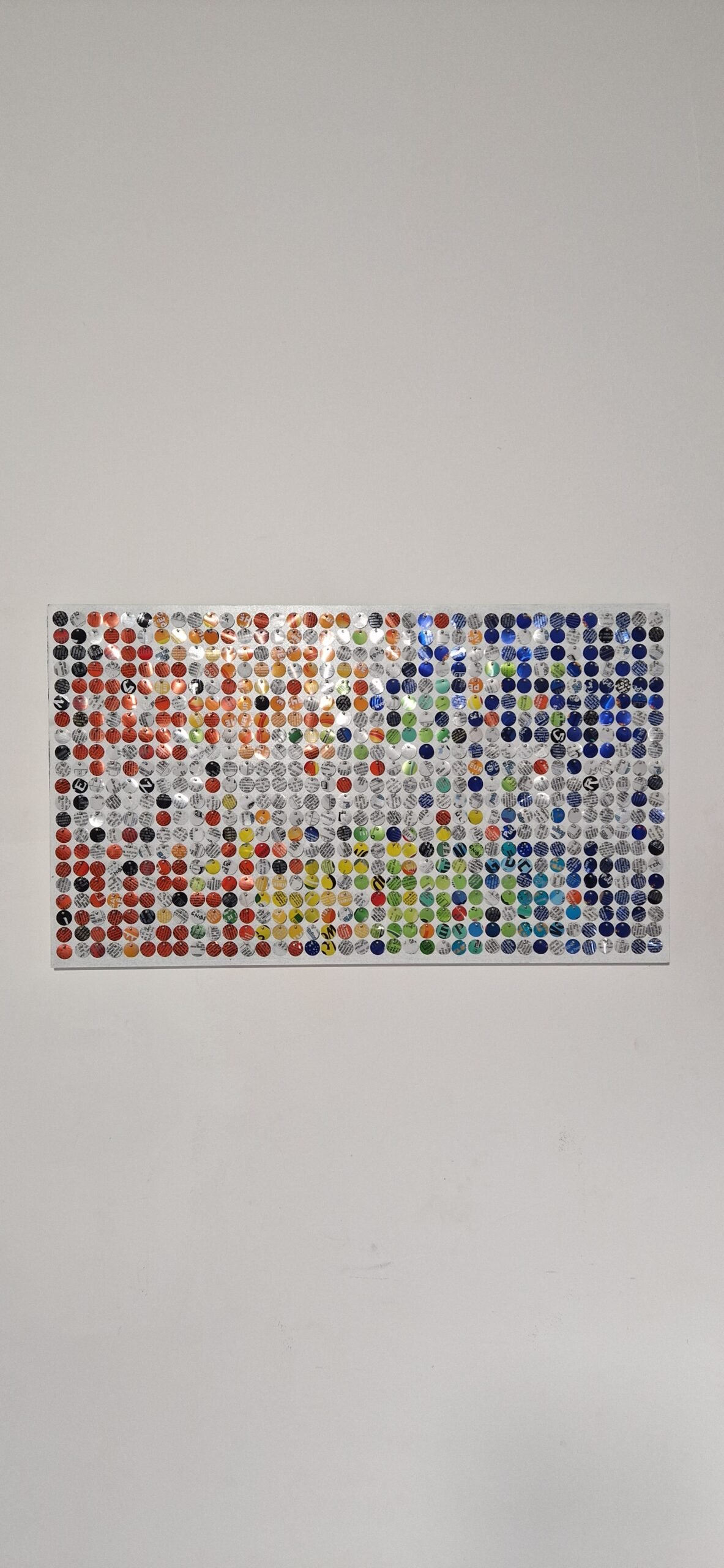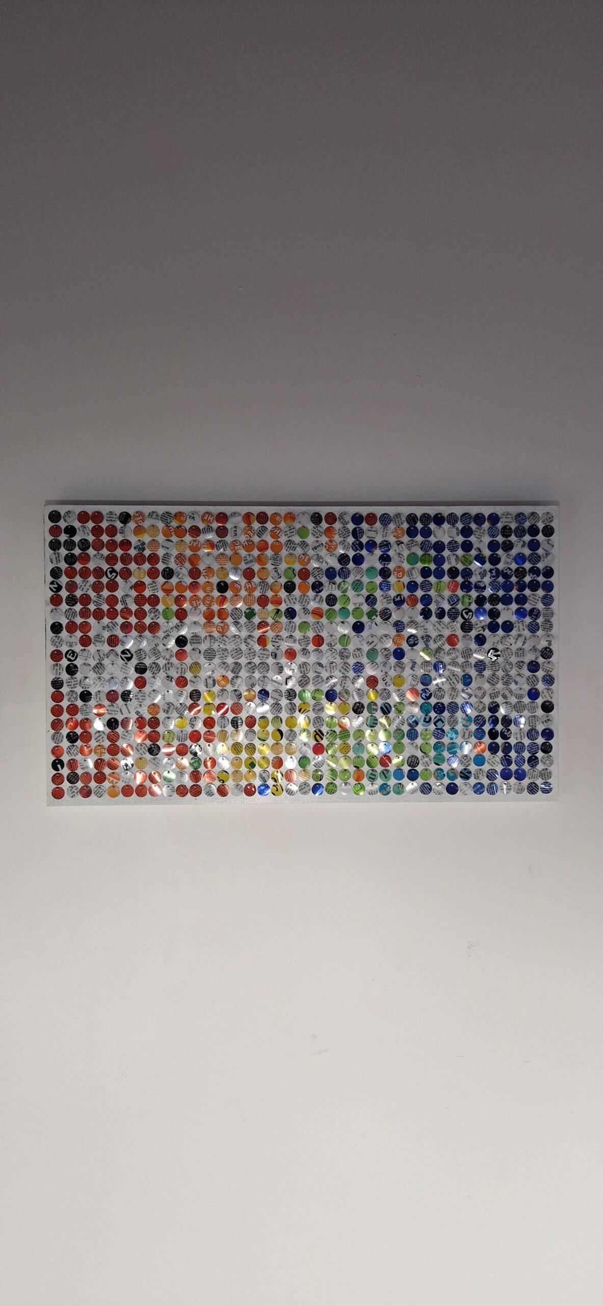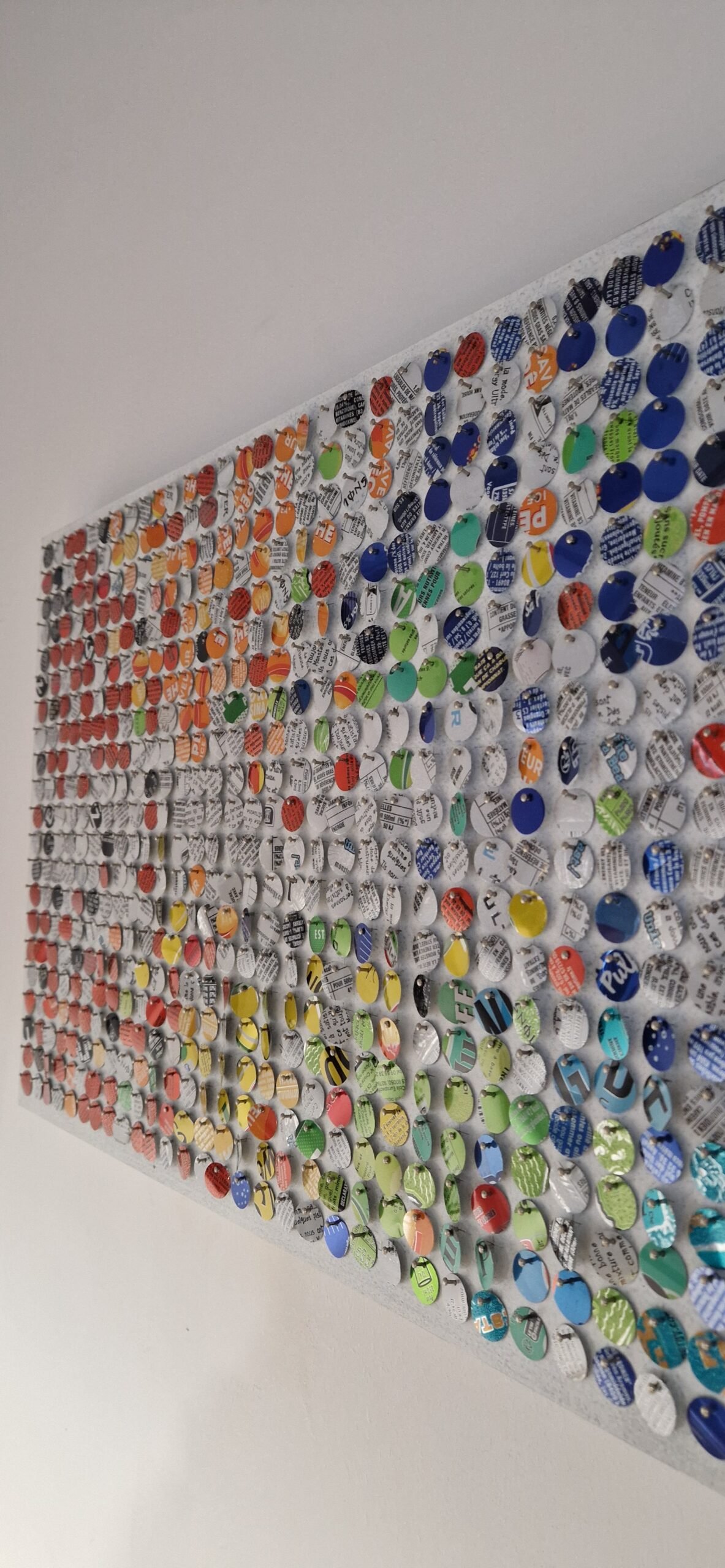 Sur le blanc lumineux, les pastilles colorées s’éparpillent comme un souffle figé. Frémissant au moindre mouvement, ce scintillant s’anime, capte la lumière et fait basculer l’image vers le vivant.