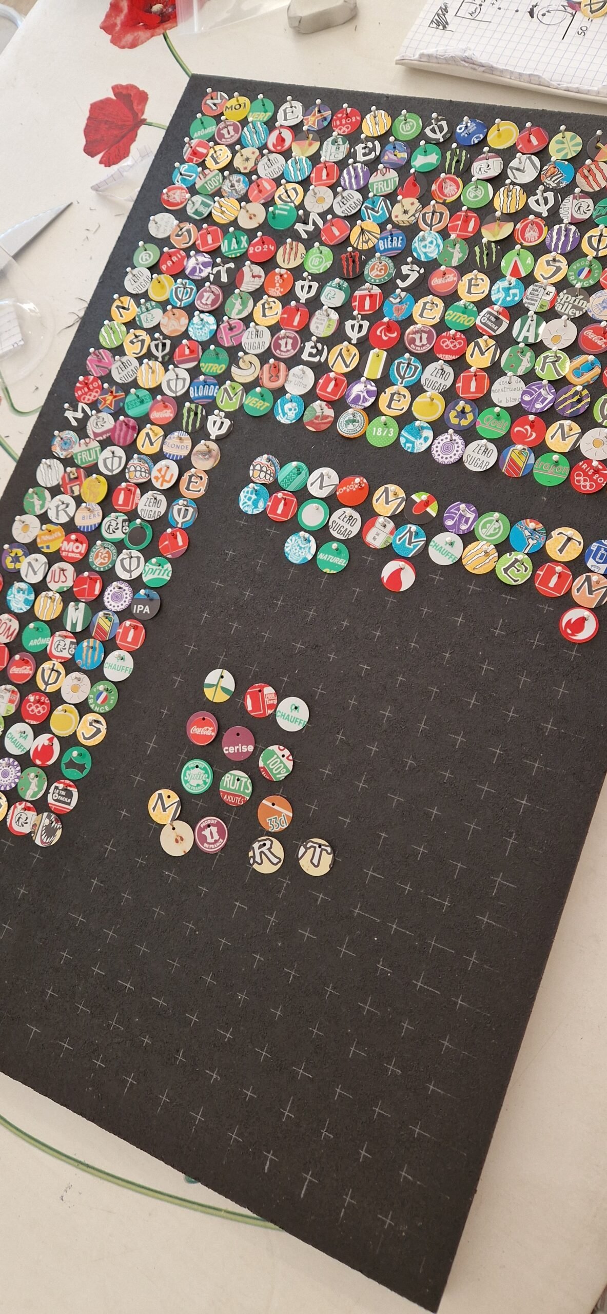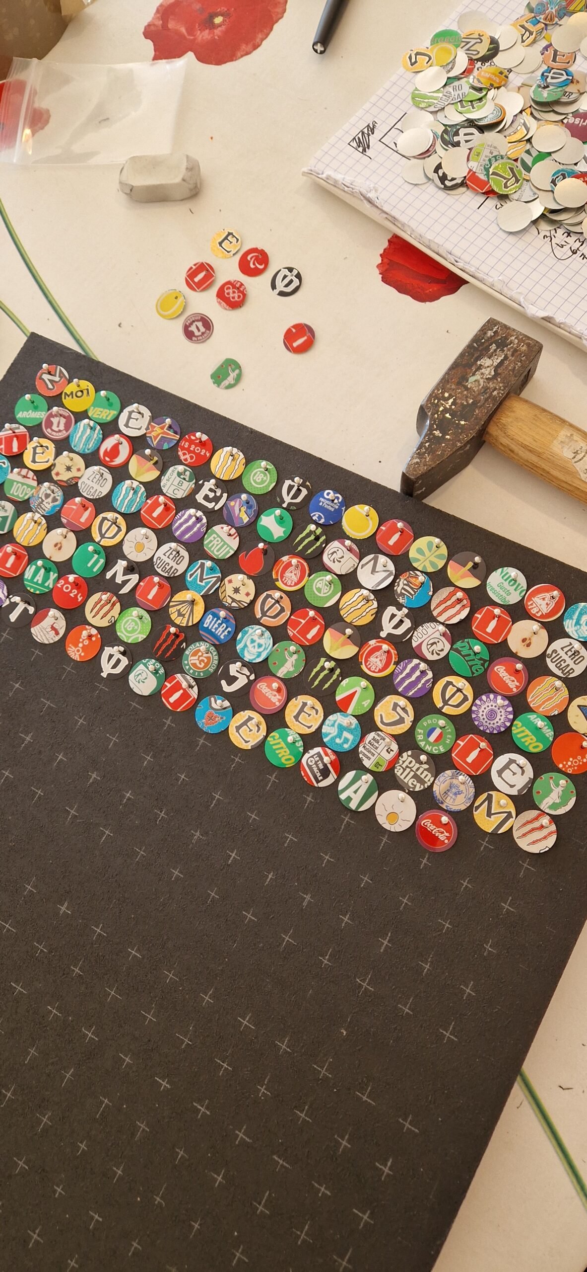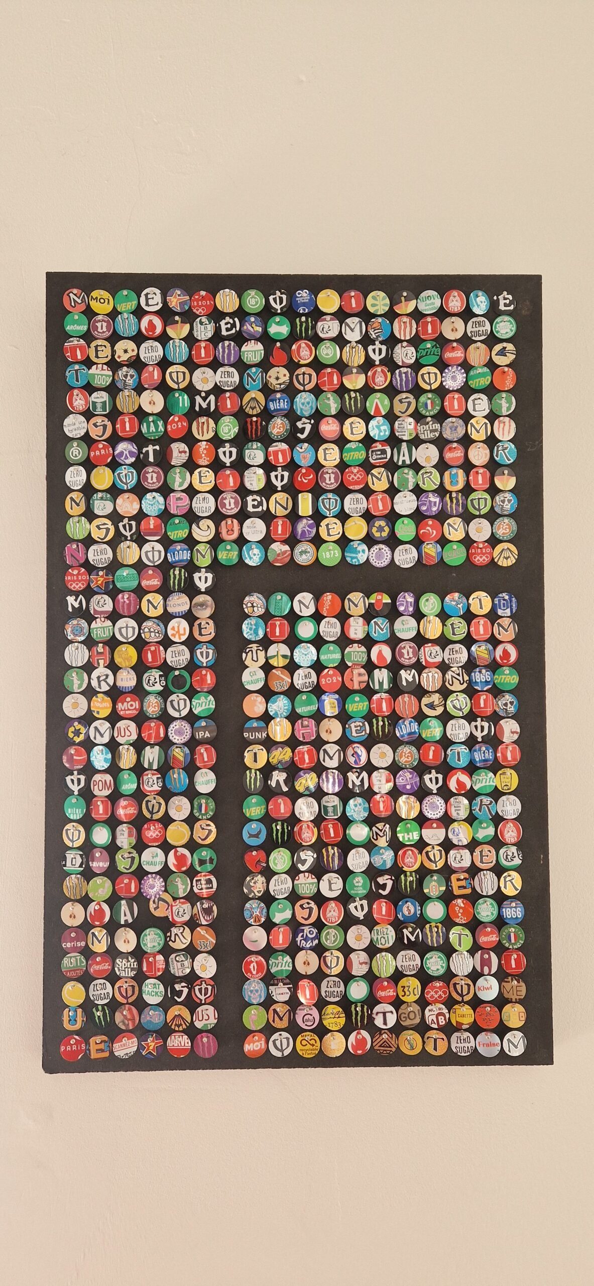 Détournés de leur fonction informative, les symboles imprimés sur l’alu deviennent matière artistique. Entre avertissement, marketing et recyclage, le scintillant expose la mémoire visuelle de la consommation.