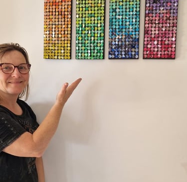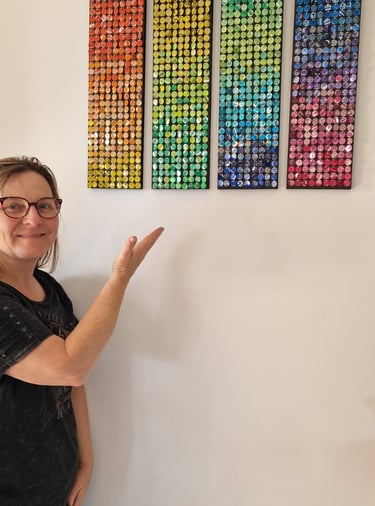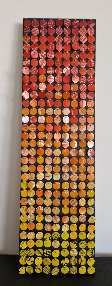 Tableaux créés à partir de canettes, fusionnant art et écologie dans une démarche unique.